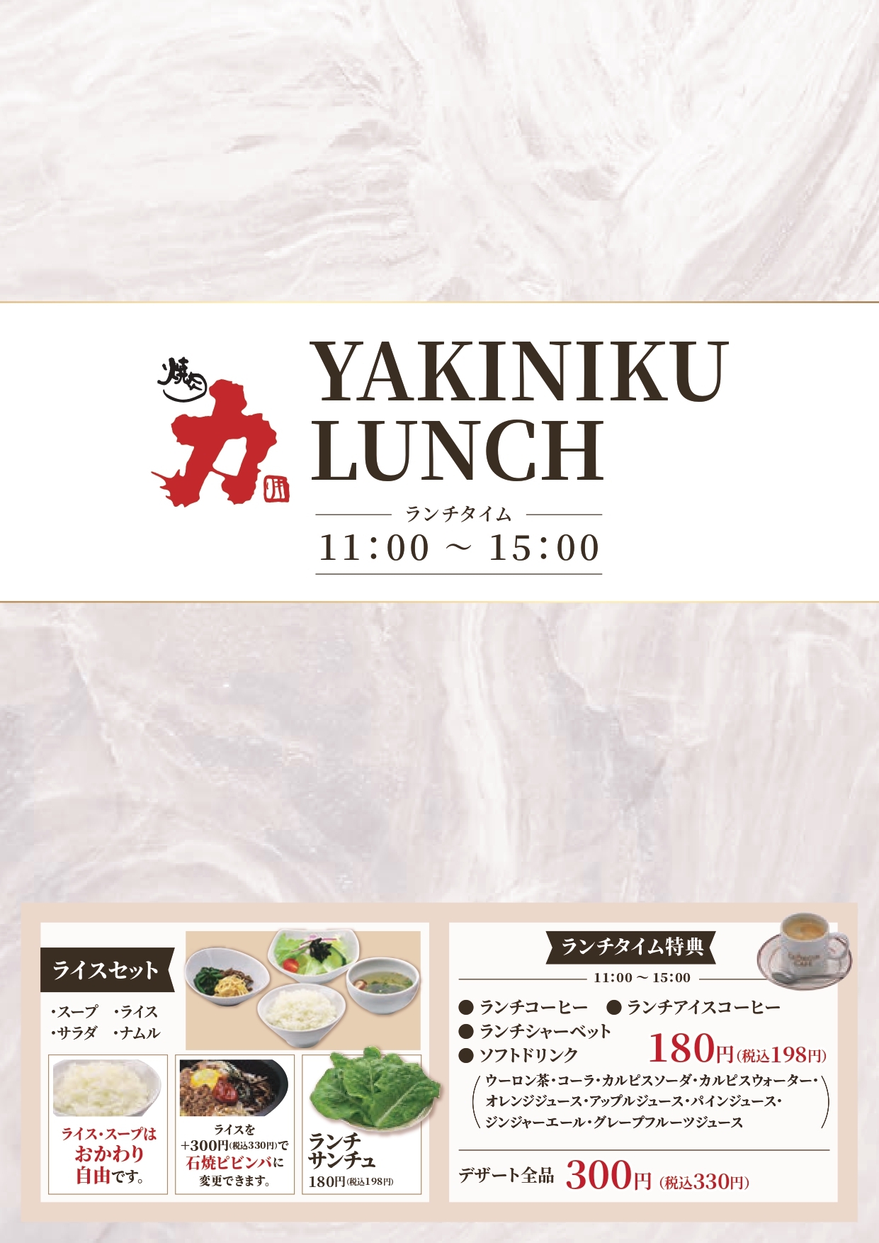 ※ライスを+税込み330円で石焼ピビンバorピビンバに変更できます。